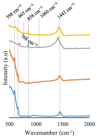 FT-IR spectra of catalysts are shown in Figure 2. For the manganese-based samples, the following signals are observed: (i) stretching vibration of the Mn-O bonds in the MnO6 octahedrons appears between 500 and 786 cm−1, and (ii) asymmetric stretching of carbonate ions at 858 and 1443 cm−1 indicates the presence of BaCO3 [,,]. For iron-based samples, in addition to carbonate ions that, according to the intensity of signals, are present in a higher amount than in manganese-based samples, the following signals are located: (i) peaks at wavenumbers slightly higher than 598 and 665 cm−1 that correspond to the stretching vibration of the Fe-O bonds of FeO6 octahedrons, indicating that the Fe-O bond is stronger than the Mn-O bond []; (ii) a signal placed at 768 cm−1 corresponding to a BaFe2O4 spinel, which is only detected for the B0.7F-E catalyst [,]; and (iii) a signal placed at 1060 cm−1 that corresponds to the stretching vibration of the C-OH bond [,,]. The presence of carbon could be due to the remaining EDTA or citric acid, which was not completely removed during the calcination step. Note that as BaCO3 was not detected by XRD, it should be an amorphous phase.