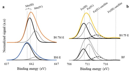 XPS spectra of the Mn 2p3/2 (a) and Fe 2p3/2 (b) transitions for BM-E, B0.7M-E, BF, and B0.7F-E catalysts.