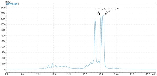 HPLC chromatogram for the determination of sugar configuration. Analytical column: Shimadzu Shim-pack GIST C18 (250 × 4.6 mm, 5 µm, Shimadzu, Japan); mobile phase: 25% CH3CN in water; flow rate: 0.8 mL/min; detection: 254 nm.