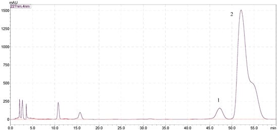 Chromatogram of the semi-preparative liquid phase with Aiglent ZORBAX SB C18, (250 × 4.6 mm, 5 μm), mobile phase: ACN (A), water (B), 0–60 min, 22% A; flow rate: 1.0 mL/min; detection: 227 nm.