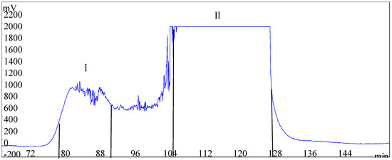 Approximately 2000 mL of the solvent system of N-Hexane/Ethyl acetate/Methanol/Water (1:6:3:4, v/v/v/v) was prepared. The mixed solvent was degassed using an ultrasonic bath for 20 min. For HSCCC separation, the column was first filled entirely with the upper phase (stationary phase), and the lower phase (mobile phase) was then pumped into the column at a flow rate of 2.0 mL/min (head to tail). The apparatus was rotated at 860 rpm in reverse mode. The separation temperature was 25 °C. The detection wavelength was 227 nm. Approximately 100 mg of the crude extract powder was dissolved in 10 mL of the solvent system and then injected into the column. After separation, two fractions named fractions I and II were collected. The fractions were condensed under a vacuum at 50 °C and reconstituted with chromatographic methanol for HPLC analysis as described in Section 3.4.