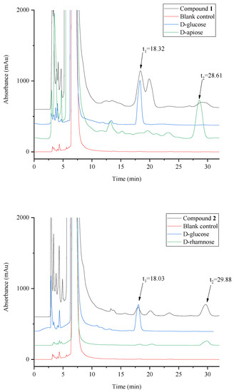 The results of the HPLC chromatogram for the determination of the sugar configuration are presented in Figure 6. The retention times of the three peaks at 18.03–18.32, 29.88 and 28.61 min coincided with derivatives of D-glucose, D-rhamnose, and D-apiose, respectively. The reaction mixture of chinensin D had corresponding signal peaks at retention times of 18.32 min and 28.61 min, and the reaction mixture of chinensin E has corresponding signal peaks at retention times of 18.03 min and 29.88 min. These experimental results showed that the sugars in chinensin D and chinensin E were D-glucose, D-apiose and D-rhamnose, and D-glucose, respectively.