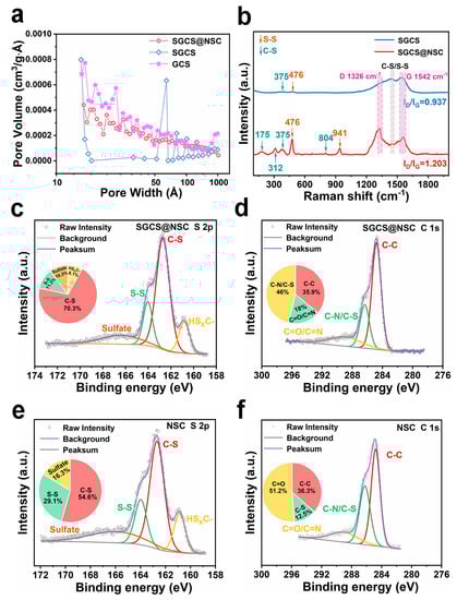 (a) Pore distribution curves of SGCS@NSC, SGCS, and GCS. (b) Raman scattering spectra of SGCS@NSC and SGCS. (c–f) The high-resolution XPS of S 2p and C 1s of SGCS@NSC and SGCS.