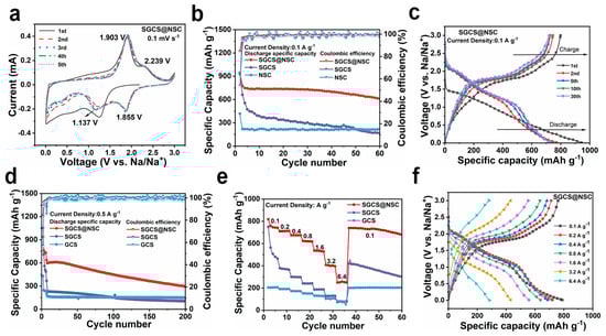 The effectiveness of the NSC coating layer is verified by the electrochemical performance in sodium ion half-cells. Figure 3a shows the initial five cycles cyclic voltammetry (CV) curves of SGCS@NSC in the range of 0.01–3.0 (V vs. Na/Na+) with a sweep speed of 0.1 mV s−1 []. After the first cycle, two pairs of peaks at 2.239/1.855 and 1.903/1.137 V in the subsequent curves correspond to the step-by-step redox reaction of sulfur [,], and the curves overlap well, indicating the excellent cycling stability of the electrode. However, the cathodic peaks current of SGCS decreases rapidly from the second cycle, and the redox peaks’ intensities are weaker than SGCS@NSC despite the higher sulfur content of SGCS (Figure S4c).