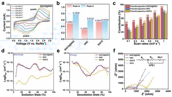 (a) CV curves of SGCS@NSC with scan rates from 0.1 to 1 mV s−1. (b) Log () versus log () plots of SGCS@NSC, NSC, and SGCS at peak A and C. (c) Normalized pseudocapacitive contribution ratios of SGCS@NSC, NSC, and GCS at different scan rates (0.1–1 mV s−1). (d,e) The Na+ diffusion coefficient of SGCS@NSC, SGCS, and NSC (discharge and charge) obtained by GITT tests. (f) EIS spectra of SGCS@NSC, NSC, SGCS, and GCS electrodes and equivalent circuit.