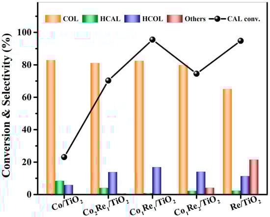 The selective hydrogenation of CAL to COL was firstly investigated over the Co/TiO2, Re/TiO2 and CoxRey/TiO2 catalysts (x:y varied from 2:1 to 1:2) using isopropanol as both the solvent and hydrogen donor at 160 °C for 12 h, and the results are shown in Figure 1. It can be seen that the monometallic Co/TiO2 catalyst showed a low conversion (23%) of CAL, although it gave a high selectivity (83%) to COL. The addition of Re obviously improved the conversion of CAL, which was consistent with the previous report that introducing the hydrophilic metal Re to the catalyst is beneficial for the adsorption of the C=O bond, thus improving the catalytic performance of the catalyst [41]. The maximum CAL conversion of 96% with a COL selectivity of 82% was achieved over the Co1Re1/TiO2 catalyst, better than the Co1Mo1/TiO2, Co1Ce1/TiO2, Co1Zr1/TiO2 catalysts and the Co1Re1 catalyst on other supports (SiO2, ZrO2, γ-Al2O3 and ZSM-5, Table S1, in the Supplementary Materials). These phenomena might be attributed to the strong adsorption of TiO2 and ReOx on exposed the C=O group [42], which improves the diffusion of the substrate and accelerates the hydrogenation of CAL [43].