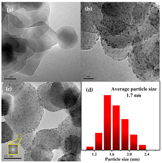 TEM images of (a) Co/TiO2 and (b,c) Co1Re1/TiO2 catalysts and (d) particle size distribution of Co1Re1/TiO2.