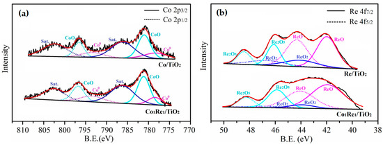 The chemical state and surface composition of Co/TiO2, Re1/TiO2 and Co1Re1/TiO2 catalysts were assessed by XPS (Figure 3), and the calculated abundances of different surface Co and Re species are summarized in Table S3. As shown in Figure 3a, the peaks in the Co 2p spectrum of Co/TiO2 at 778.2 and 793.4 eV are assigned to Co0, the peaks at 781.0 and 796.8 eV are attributed to CoO, and the peaks at 796.1 and 802.5 eV are satellite peaks [47]. The observation of CoO was due to the oxidation of surface metallic Co nanoparticles in the air. As shown in Figure 3b, the binding energy in the range of 39–50 eV belonged to the Re 4f region, which was deconvoluted into doublet peaks for 4f5/2 and 4f7/2 orbits, implying the presence of ReO (4f5/2 = 44.2 eV, 4f7/2 = 41.9 eV), ReO2 (4f5/2 = 46.3 eV, 4f7/2 = 44.0 eV), and Re2O5 (4f5/2 = 48.3 eV, 4f7/2 = 46.0 eV) [48] in Re/TiO2 with an atomic ratio of 65:16:19 (Table S2), and no metallic Re was detected, which was contributed to the high affinity of Re for oxygen [49]. Compared to their monometallic counterparts, the content of ReO in Co1Re1/TiO2 significantly increased to 71%, which may promote the spillover of hydrogen on its surface and therefore be beneficial to the hydrogenation process [46].