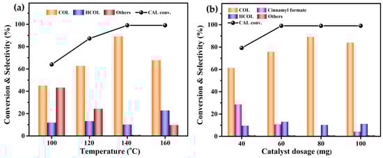 The effects of the reaction temperature and catalyst dosage for the hydrogenation of CAL to COL were investigated over Co1Re1/TiO2, and the results are shown in Figure 4. Figure 4a shows the results of the hydrogenation of CAL at varied temperatures (from 100 to 160 °C). During the reaction, no HCAL was detected. The catalyst showed low activity for the reaction at a low temperature of 100 °C. Increasing the reaction temperature to 140 °C achieved a remarkable increase in the catalytic performance. However, the excessive reaction temperature (160 °C) led to a significant increase in the excessive hydrogenation of HCOL and other by-products. Thus, 140 °C was the appropriate reaction temperature for CAL-selective hydrogenation to COL. Fixing the reaction temperature at 140 °C, the hydrogenation of CAL was carried out over the Co1Re1/TiO2 catalyst at a dosage in the range from 40 to 100 mg, and the results are shown in Figure 4b. It can be seen that the yield of COL was significantly improved with the increase in catalyst dosage from 40 to 80 mg. However, an excessive catalyst dosage reduced the selectivity of COL increased the excessive hydrogenation by-product HCOL and other by-products. As expected, our rationally designed Co1Re1/TiO2 catalyst exhibited higher activity and selectivity for the hydrogenation of CAL to COL compared with TiO2, Co/TiO2, and Re/TiO2 catalysts (Table S4), and it showed significant advantages compared with the relevant literature (Table S5) [24,27,30,32,33,34,35,45,51,52,53,54,55,56,57,58,59,60,61]. The results of the selective hydrogenation of CAL to COL suggest that the synergistic effect among the TiO2 support and Co and Re metals is the main reason for the enhanced performance of the Co1Re1/TiO2 catalyst.