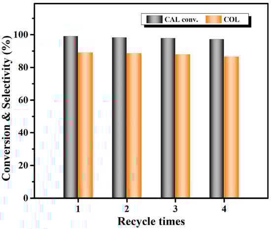 Supported metal nanoparticle catalysts have been widely used in the industry due to their merits of easy separation and recovery [7,14]. The radial expansion of a metal D-bandwidth and d orbital is related to the selectivity of products (including COL, HCAL and HCOL) [15]. Metal with a small D-bandwidth (such as Ni) is conducive to the formation of HCAL [16], while some noble metals with a relatively large D-bandwidth (such as Ru, Ir, Au and Pt) can be used as catalysts for the synthesis of COL [17,18,19,20,21]. However, the high cost and rarity of noble metal catalysts hinder their industrial application. Non-noble Co has shown potential in the selective hydrogenation of CAL to COL due to its larger D-bandwidth and low price. For example, Zhang et al. [22] investigated the performance of the Co/ZSM-5 catalyst for the hydrogenation of CAL to COL at 90 °C and 20 bar H2 for 6 h, with a 72.7% conversion of CAL and a 78.5% selectivity to COL. In another work using Co/ZSM-5 as the catalyst, a maximum COL yield of 61.9% was achieved at 100 °C and 20 bar H2 [23].