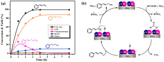 To speculate the possible reaction pathway, the time course experiments of the hydrogenation of CAL over the Co1Re1/TiO2 catalyst was carried out under optimal reaction conditions (Figure 6a). As shown in Figure 6a, CAL was rapidly converted (73%), and a 42% yield of COL was achieved at the initial 1 h, accompanied by 26% of cinnamyl formate and 5% of HCOL. Under the weak alkaline condition of NEt3, cinnamyl formate could be easily formed through esterification of COL with formic acid [63], which then smoothly decreased and disappeared within 4 h with the decomposition of formic acid. CAL was almost completely converted at 4 h, and COL and HCOL were offered with yields of 88% and 10%, respectively. It is recognized that the decomposition mechanism of FA in the presence of NEt3 is as follows [34,64,65] NEt3 acts as a proton scavenger to facilitate the O-H bond cleavage, thus forming metal–formate species during the initial step of the reaction. Then metal–formate produces molecular hydrogen through a β-elimination pathway. This hydrogen desorption step is irreversible, indicating that it is feasible to use renewable FA as a convenient hydrogen donor instead of molecular H2 for sustainable and green organic synthesis. The proposed mechanism is shown in Figure 6b. The Co1Re1/TiO2 catalyst and FA produce metal–formate species in the presence of NEt3, which are then decomposed to generate metal–hydride species and CO2. Meanwhile, the C=O bond on CAL is adsorbed on the ReOx species and is coordinated with metal–hydride. Finally, it is neutralized with +HNEt3 to form COL, thereby realizing the regeneration of the Co1Re1/TiO2 catalyst and NEt3.