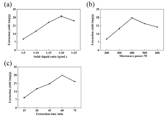 Microwave-assisted extraction is one of the most commonly used extraction methods. Microwave heating can improve the diffusion ability of target components, thereby shortening extraction time [17]. This showed that the microwave power has a certain impact on the TTC (Figure 1b). The TTC reached a maximum at 400 W, and then showed a downward trend. This result is consistent with previous reports also showing that the TTC increased with increasing microwave power within a certain microwave power range [18,19]. When the microwave power is too high, the solvent volatilizes. Therefore, a microwave power of 300~500 W was selected for further optimization.