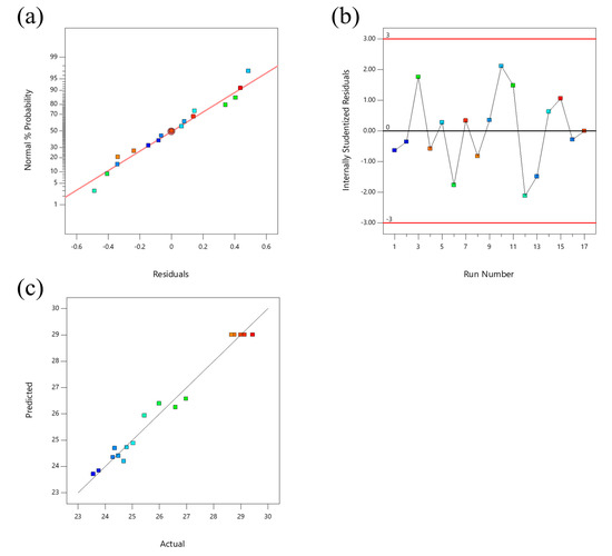 Diagnostic plots for model adequacy for extraction of TTC. (a) Residual normal probability plot; (b) studentized residuals; (c) predicted and actual values. The data points with different colors in the figure represent the test groups with different TTCs.