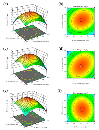 Figure 3a,b show the comprehensive effects of the solid–liquid ratio and microwave power on the TTC. It is clearly shown that when the solid–liquid ratio was increased to 1:20 g/mL and the microwave power increased to 400 W, the TTC increased and reached its peak. As the two factors further increased, the TTC gradually decreased. The results showed that only a proper solid–liquid ratio and a certain extraction power could significantly improve the TTC, and too low or too high values of these factors would lead to a decrease in extraction yield. In addition, the contour map was elliptical, indicating that the interaction between the ultrasonic power and extraction time was significant [26].