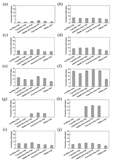 The content of active substances in L. indica varies during the plant growth process. Dong [29] pointed out that the TTC in L. indica showed a downward trend before flowering, and then increased sharply to reach a maximum value. The research results of Wang [30] showed that the seedling stage was the harvesting stage with the highest TTC in L. indica. In this experiment, the total triterpenoids were extracted from fresh samples of LIM in different periods. The results showed that the TTC in the initial flowering stage was the highest, after which a downward trend was observed. The freeze-dried plants also returned similar results, indicating that the initial flowering period is the most suitable period for the extraction of total triterpenoids in LIM. In addition, the TTC of different parts of LIM showed dynamic changes during the growth process.