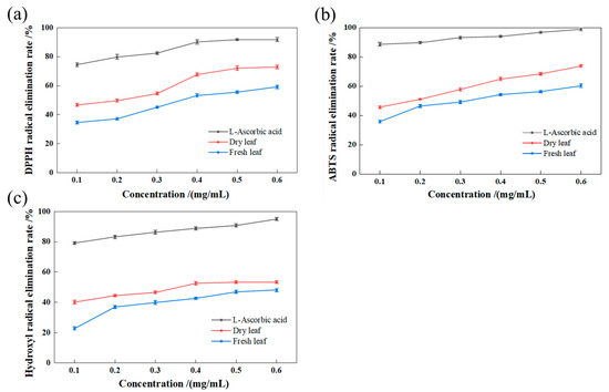 Antioxidant activities (a)—DPPH radical elimination ability; (b)—ABTS radical elimination ability; (c)—hydroxyl radical elimination ability) of total triterpenoids in fresh and dried leaves of LIM.