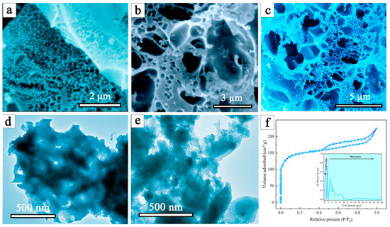 (a–c) SEM images of DMAL, (d) TEM image of alkaline lignin carbon, (e) TEM image of DMAL, and (f) nitrogen adsorption-desorption isotherms of the DMAL carbon material, inset shows the pore size distribution of DMAL.