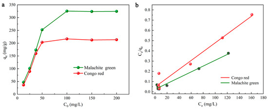 where the Langmuir constant KL is defined as the attraction of the active site of DMAL [49]. When the Langmuir model is used, a curve can be obtained, as shown in Figure 5a,b. With Ce on the horizontal axis and Ce/qe on the vertical axis, a straight line can be fitted to find qmax (mg/g) and KL (L/g) by slope and intercept [50]. The qmax (mg/g) for MG is calculated to be 352.11, 346.76 and 342.43 mg/g at different temperatures (303.15 K, 318.15 K, 333.15 K), while that for CR is calculated to be 232.02, 231.45 and 227.85 mg/g at different temperatures (303.15 K, 318.15 K and 333.15 K), and other parameters are also listed in Table 1. The correlation coefficient (R2 > 0.982) indicates that the results of adsorption experiments are consistent with those of the Langmuir model.