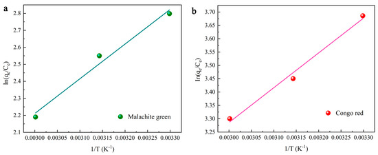 With an increase in temperature, the adsorption capacity declines (Figure 4c). The thermodynamic parameters, including free energy (ΔG0), enthalpy (ΔH0) and entropy (ΔS0), can be obtained using Equations (3)–(5). These parameters are required to evaluate the thermodynamic properties of the adsorption of MG and CR on DMAL [63]. The calculation process for these parameters is shown in Figure 6.