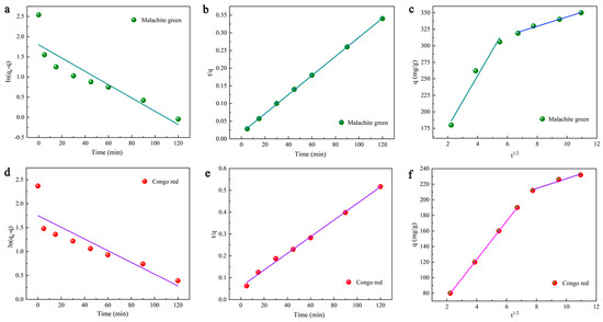 Adsorption kinetic studies of dye adsorption onto DMAL, pseudo-first-order model of MG (a) and CR (d); pseudo-second-order model of MG (b) and CR (e); intragranular model of MG (c) and CR (f).
