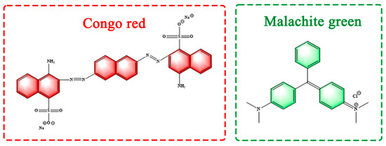 Nowadays, organic dyes are usually applied to the production of colored paper, wood, textiles and food materials, etc. The production process in these industries often leads to the release of dye effluent in large amounts, which puts the ecosystem and human health at risk [1]. Dyes are one of the major water pollutants. The typical dyes include azo, anthraquinone, indigo and phthalocyanine derivatives, all of which are persistent due to their complex structures and xenobiotic properties [2,3]. As a common anionic benzidine azo dye, Congo red (CR) can produce toxic substances in an anaerobic environment and cause pollution when discharged into water [4]. Malachite green (MG) is a cationic triarylmethane dye as well as one of the most used dyes for coloring. It requires a type of therapeutic agent to treat fungal and bacterial infections in fish and is applicable as an antiseptic to treat wounds and ulcers. However, MG has the potential to cause cancer, mutations, teratogenicity and respiratory toxicity. It is thus important to remove MG dyes from wastewater prior to their discharge [5]. Usually, among various organic dyes, synthetic dyes (e.g., CR, MG, rhodamine B and methyl orange) are known as one of the major pollutants due to their cost reduction, easy access and effectiveness. This is attributed to the lack of suitable substitutes, the difficulty in controlled release, their latent toxicity, as well as mutagenic and carcinogenic activities [6,7]. In addition, many dyes have been found to be carcinogenic, which has an adverse effect on the development of plants and animals in lakes, rivers and so on. The color of dyes decreases the penetration of light in water bodies and affects photosynthetic activity, which makes it attractive to explore the recovery of organic dyes from water [8]. Reportedly, there are over 100,000 known varieties of commercial dyes in the global field, the production capacity of which exceeds 700,000 tons annually [9]. Therefore, it is imperative to achieve the purification of dye wastewater for water resources conservation.