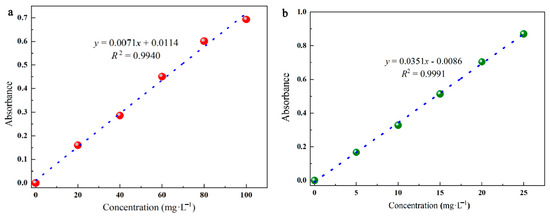 The standard curves were created using the following process. CR and MG were obtained in different concentration gradients, and their absorbance at the maximum absorption wavelength was measured at each concentration. As shown in Table 5, the linear relationship between the absorbance and the concentration was fitted, while the correlation coefficient R2 was applied to determine the goodness of the fitted relationship (0.99 or above). (The fitted standard curve is shown in Figure 9).