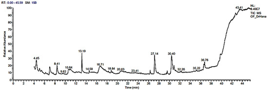 The RCFE was subjected to GC–MS analysis using a Trace GC1310-ISQ mass spectrometer (Thermo Scientific, Austin, TX, USA) equipped with a direct capillary column TG-5MS (30 mm × 0.25 mm × 0.25 μm film thickness, Thermo Scientific, Austin, TX, USA). The column’s oven was initially maintained at 50 °C and then gradually heated to 200 °C at a rate of 7 °C/min, held for 2 min, and further heated to 290 °C at a rate of 15 °C/min and held for 2 min. The injector temperature was set at 260 °C, and helium was used as the carrier gas with a constant flow rate of 1 mL/min. An AS3000 autosampler and GC in split mode were used to inject 1 μL of the diluted sample after a 4 min solvent delay. The mass spectra were obtained in a full scan mode at 70 eV ionization voltage across the m/z 50–650 range. The transfer line and ion source temperatures were adjusted to 250 and 270 degrees, respectively. The components were identified by comparing their mass spectra retention times to those in the NIST 11 and WILEY 09 mass spectral databases.