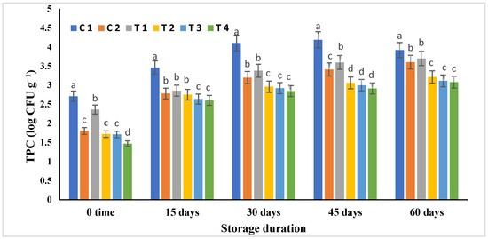 Figure 3 shows the results of a microbial analysis of all mayonnaise treatments during storage at 4 °C for 60 days. Total plate count (TPC) for all mayonnaise samples stored at 4 °C substantially increased (p ≤ 0.05) over time (Figure 3). Possible sources of microbial contamination include the use of contaminated eggs, utensils, and equipment, as well as environmental factors such as air quality, temperature, and relative humidity and storage conditions [16]. Mayonnaise samples containing BHT and RCFE had considerably diminished (p ≤ 0.05) TPC compared to the mayonnaise control sample through all storage periods. At time zero, the TPC of all mayonnaise samples was low, except for the C1 and T1 samples (2.71 and 2.36 log CFU g−1, respectively). With storage time progression, the TPC substantially elevated (p ≤ 0.05) in all mayonnaise samples. After 60 days of storage, the lowest TPC (3.08 and 3.11 log CFU g−1) was detected in both the T4 and T3, whereas the highest TPC (3.92 log CFU g−1) was found in the control (C1).