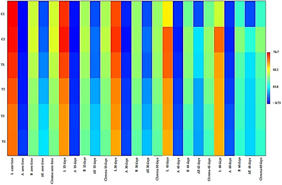 Based on the above results, it could be observed that the color parameters (L*, a*, and b*) were significantly changed during storage for all mayonnaise samples. Hence, significant variations in the values of ΔE were found in some cases (Table 14). At zero time, the highest color changes (ΔE) were observed in the case of T4 (16.95), followed by T3 (15.38), T2 (11.15), and T1 (6.04). Conversely, the mayonnaise enriched with BHT (C2) recorded the lowest color changes (2.10). At the end of storage (60 days), the highest color changes (ΔE) were observed in C2 (24.04), followed by T1 (16.49). In contrast, the RCFE-enriched mayonnaise samples T2, T3, and T4 recorded nearly the same color changes (15.14–15.19) compared to the control (C1). Despite these changes, all enriched mayonnaise samples had an acceptable color. It is well-understood that preferred colors are most similar to the original color of control samples [31,32].