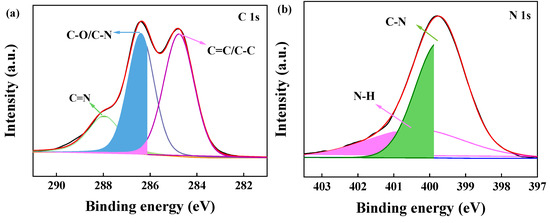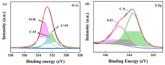To further investigate the chemical compositions of the adsorbent, BJ160 was analyzed by XPS, and the XPS-peak-differentiation-imitating analyses of C1, N1, O1, and S1 spectra of BJ160 are shown (Figure 3). The peak at 287.96 eV (C1s) represents the C=N bond [30], and the peak at 286.38 eV (C1s) is associated with the C-O and C-N bonds [31], while the peak at 284.76 eV corresponds to the C=C and C-C peaks (Figure 3a) [32]. For the N1s peaks, the peak corresponding to the C-N bond is located at 399.72 eV [33], and the peak corresponding to N-H is located at 400.40 eV (Figure 3b). For the O1s peaks, the peak at 532.15 eV corresponds to the C=O double bond of carbonyl group [34], and the peak at 532.62 eV corresponds to the C=O double bond, while the peak at 533.05 eV corresponds to the O-H bond of carboxyl group (Figure 3c) [35]. For the S2p peaks, the peak at 164.83 eV corresponds to S-O bond, and the peak at 163.67 eV corresponds to C-S bond. The XPS results demonstrated the presence of O-, N- and S-containing functional groups on the surface of BJ160.