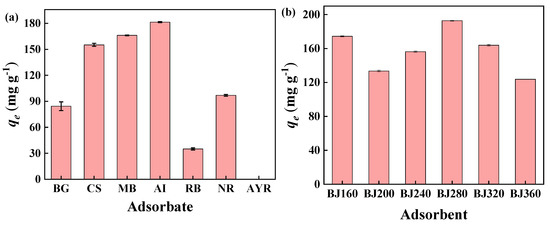 Batch adsorption experiments were carried out. The adsorption of various cationic dyes (BG, CS, MB, AI, RB), neutral dye (NR) and anionic dye (AYR) by BJ160 was investigated, and the experiments were carried out at the natural pH values of the dyestuffs (Figure 4a). The results showed that PoBJ biochar possessed relatively higher adsorption capacities toward cationic and neutral dyes, almost no adsorption occurred for anionic dye (AYR) could be observed. The obvious difference can be attributed to the O-, N- and S-containing functional groups of BJ160 were negatively charged. The results demonstrated that PoBJ biochar might be used as an adsorbent for selective adsorption of cationic dyes.