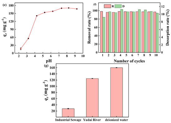 In order to investigate the adsorption of MB dye by BJ biochar in actual water samples, 50 mg L−1 solutions of MB dye were prepared using deionized water, industrial sewage and lake water (Yudai River), respectively. Compared to the MB solutions prepared using deionized water, a decrease in adsorption capacity of BJ160 for MB in both industrial wastewater (27.61 mg g−1) and Yudai River (125.04 mg g−1) could be observed (Figure 5g). The presence of a large amount of metal ions (e.g., Zn2+, Pb2+, Fe3+, Ca2+, etc.) in the actual water sample, especially in industrial wastewater, competed with MB molecules for the effective adsorption sites on BJ160, causing a sharp decrease in its adsorption capacity. The industrial wastewater tested in this study was provided by a local metallurgical plant, which contains inorganic metal ions such as Zn2+ and Pb2+. In addition, the industrial wastewater was acidic (pH = 3.73), which hindered the electrostatic interactions between BJ160 and MB due to the competitive adsorption effects of H+.