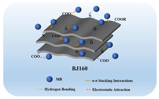 The structural properties, surface functional groups and charge density of an adsorbent dominated its adsorption capacity [50]. The adsorption of organic dyes by various biochar commonly occurs through multiple interactions including hydrogen bonding, ion exchange, electrostatic forces and π-π stacking interactions [40]. The characterization of the adsorbent pre- and post-adsorption could provide important information that allows us to reveal the possible adsorption mechanism. From FT-IR analyses, the successfully adsorption of MB onto BJ160 could be found, and the hydrogen bonding as well as the π-π stacking interactions could be confirmed. From zeta potential analysis, it can be concluded that BJ160 was negatively charged. The relatively lower pyrolysis temperature (160 °C) was far below 300 °C, allowing the good preservation of a large number of O-, N- and S-containing functional groups, which could interact with positively charged MB molecules by electrostatic attractions [51]. Meanwhile, the calculated ΔH° value (−29.42 kJ mol−1) fell within the range 1–40 kJ mol−1, again confirming the physical adsorption via electrostatic attraction which occurred between the adsorbent and the dye molecules at all temperatures tested [43]. In addition, cationic dyes were readily adsorbed by BJ160 while no adsorption to anionic dyes could be observed. Therefore, we could propose that the electrostatic attraction was the principal mechanism by which MB was adsorbed (Figure 6).