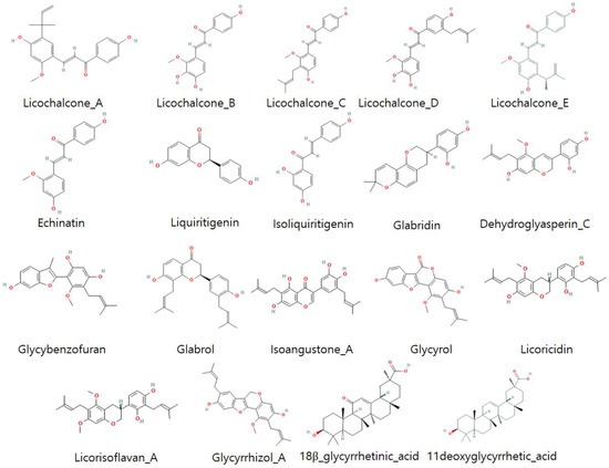 | 3 | Licochalcone A | Antiviral, antimicrobial, immunoregulatory | [21,25] |
