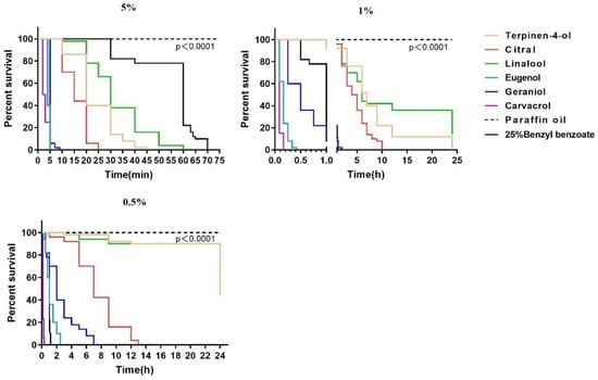 Survival curves of Sarcoptes scabiei mites exposed to 5%, 1%, and 0.5% solutions of six terpenes.