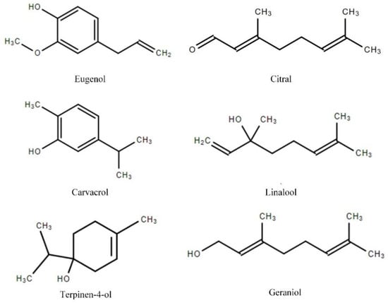 A large number of essential oils have been shown to be effective against Sarcoptes scabiei [10,11,12,13]. The essential oils of tea tree (Melaleuca alternifolia) [14], lemongrass (Cymbopogon citratus) [15], lavender (Lavandula angustifolia Mill.) [16], clove (Eugenia caryophyllata) [16,17], palmarosa (Cymbopogon martinii) [16], cinnamon (Cinnamomum zeylanicum), and tulsi (Ocimum sanctum) [18] are promising agents for scabies control. However, the results from in vitro studies using essential oils have not always been consistent due to their complex and varied compositions [19]. Therefore, single miticidal components should be tested so that they can be used at known concentrations and application rates. Previous studies have demonstrated that terpinen-4-ol, citral, linalool, eugenol, geraniol, and carvacrol possess good miticidal effects against Psoroptes mites [20,21,22]. Terpinen-4-ol and eugenol have been evaluated against S. scabiei [14,17], but the miticidal activities of citral, linalool, geraniol, and carvacrol have not been tested against S. scabiei.