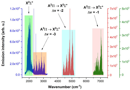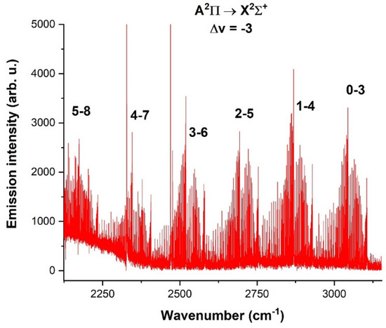 - Brooke, J.S.A.; Ram, R.S.; Western, C.M.; Li, G.; Schwenke, D.W.; Bernath, P.F. Einstein A coefficients and oscillator strengths for the A2Π – X2Σ+ (red) and B2Σ+ – X2Σ+ (violet) systems and rovibrational transitions in the X2Σ+ state of CN. Astrophys. J. Suppl. Ser. 2014, 210, 23. [Google Scholar] [CrossRef]