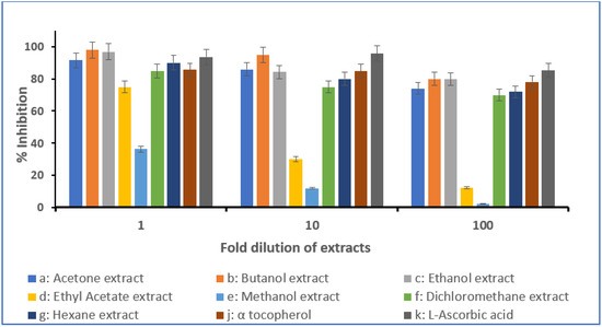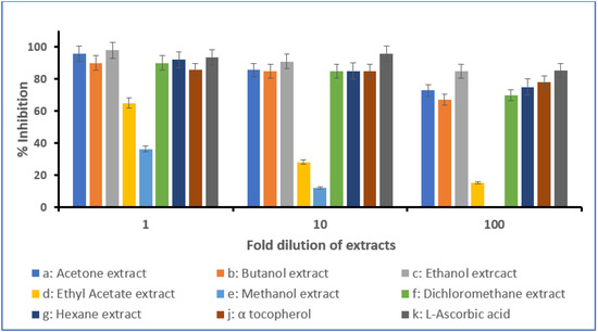 The concentration of the extracts was adjusted to 10 mg/mL and their antioxidant activities were tested using DPPH (2,2-diphenyl-1-picrylhydrazyl) at 1-, 10- and 100-fold dilutions. These test results were compared to the antioxidant activity of α-tocopherol (1 mg/mL) and ascorbic acid (1 mg/mL) which served as the positive control. The extracts were mixed with DPPH (1 mL of 0.1 mM solution in methanol) in a test tube and shaken vigorously before being left in the dark at 27 °C for 45 min. The control sample was prepared in the same way but without the extracts. The absorbance of the tested samples was measured by a spectrophotometer at 517 nm. The total antioxidant activity of the tested extracts/samples was determined as an inhibition percentage, calculated using the formula below [35]: