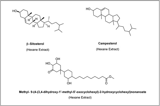 Campesterol, another phytosterol isolated from the hexane extract has also been extensively reported from various plants and its activity has also been studied to a commendable extent. Its structure has a cholesterol skeleton with a different side chain and shows cholesterol-lowering effects. Campesterol is also found to have antibacterial, anti-inflammatory, antifungal and anticancer activities [56]. The anti-inflammatory property exhibited by campesterol explains the traditional use of Anastatica hierochuntica to treat menstrual cramps [4]. The other compound, methyl-9-(4-(3,4-dihydroxy-1′-methyl-5′-oxocyclohexyl)-2-hydroxycyclohexyl) nonanoate identified in the hexane extract of Anastatica hierochuntica has not been reported on previously. Preliminary investigations have revealed that this compound exhibits both weak antibacterial activity against E. coli and S. aureus and weak anti-fungal activity against Saccharomyces cerevisiae and A. fumigatus. Further detailed research for biological activities of this compound is underway.
