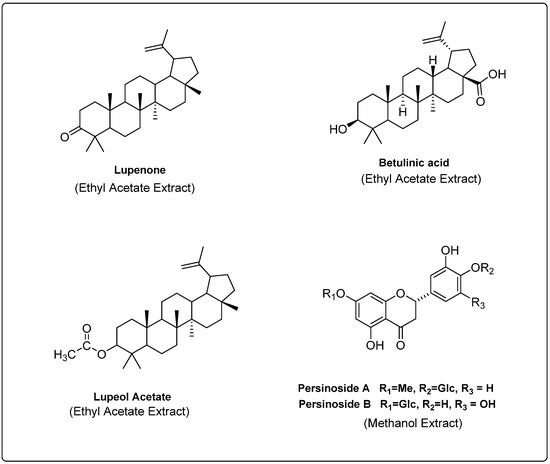 Aerva javanica: The ethyl acetate and methanol extracts, which showed significant or higher antioxidant and antibacterial activity, were further fractionated by HPLC to isolate pure compounds. This process led to fractionation and isolation of at least 13 compounds from the 2 extracts. Of these 13 compounds, 5 compounds with large enough quantity from the ethyl acetate extracts and 1 compound from the methanol extracts were used for further characterization and identification of the compounds. Spectroscopy techniques (FTIR and NMR) were used to elucidate structures of the five compounds. The compounds identified from the ethyl acetate extracts were lupenone, betulinic acid and lupeol acetate (Figure 3; Supplementary Data S1). The compounds identified from the methanol extracts were persinoside A and B (Figure 4; Supplementary Data S1).