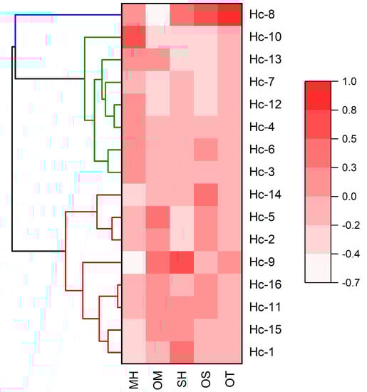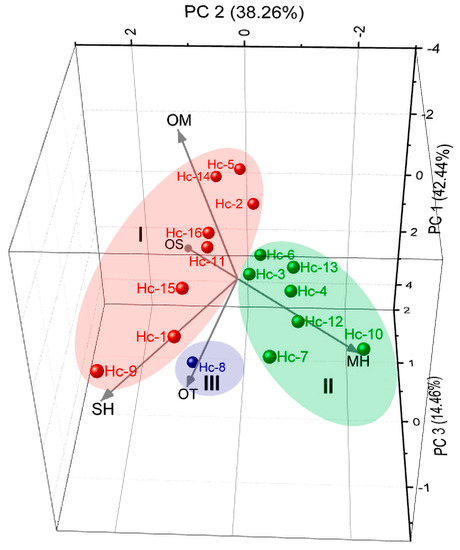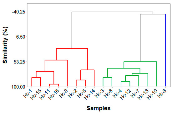 The HCA (Figure 2) shows the formation of three groups I (Chemotypes). The first one comprises eight samples:Hc-1, -2, -5, -9, -11, -14, -15, and -16. The second group comprises Hc-3, -4, -6, -7, -10, -12, and -13 samples. The third group comprises the Hc-8 sample.