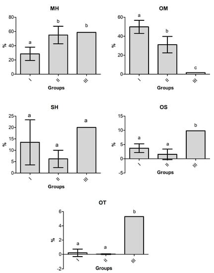 Compound classes of the H. crenata chemotypes. Mean ± standard deviation. Values with the same letters (a or b) in the bars do not differ statistically in the Tukey test (p > 0.05). MH—monoterpene hydrocarbons, OM—oxygenated monoterpenes, SH—sesquiterpene hydrocarbons, OS—oxygenated sesquiterpenes, OT—other compounds.