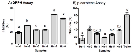 In the β-carotene/linoleic acid assay, the highest inhibition was from Hc-2 (40.0%), Hc-3 (29.4%), and Hc-6 (39.0%), only about one-third the values of Trolox, followed by Hc-5 (26.7%), Hc-4 (18.0%), and Hc-1 (16.4%).