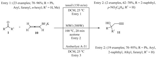 The propargylation of aldehydes/ketones 1 using potassium allenyltrifluoroborate 10 promoted by tonsil, an inexpensive and readily available clay, in a chemo- and regioselective manner was described, leading to homopropargyl alcohols 11 in good to moderate yields (Scheme 4, entry 1) [24]. The described method is simple and avoids the use of air- and moisture-sensitive organometallics. In the same way, alcohols 11 were synthesized under MW irradiation (Scheme 4, entry 2) [17] or by using Amberlyst A-31 (Scheme 4, entry 3) [25].