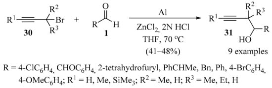 The synthesis of homopropargyl alcohol 31 with a two-carbon extension was achieved through the propargylation of aldehydes 1, mediated by zinc(0). This reagent was generated in situ from the redox coupling of Al and ZnCl2 in 2N HCl and THF, producing products 31 in acceptable to good yields (Scheme 10) [57].