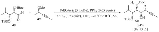 Isolated in 2008 from the marine sponge Siliquariaspongia mirabilis, mirabalin [80] was found to inhibit the growth of the tumor cell line HCT-116, with an IC50 value of 0.27 μM. This compound belongs to the chondropsin family of macrolide lactams, which comprises chondropsins A−D, 73-deoxychondropsin A, and poecillastrins A−C [81]. Alcohol 50 is a key intermediate in the convergent and flexible stereoselective synthesis of one isomer of the C44−C65 fragment of mirabalin [82]. To synthesize alcohol 50, aldehyde 48 was subjected to stereoselective Marshall allenylation [83] through the addition of a chiral allenylzinc reagent, prepared in situ via palladozincation of the (S)-propargylic mesylate 49. This method delivered propargyl alcohol 50 with good diastereoselectivity in favor of the anti,syn,anti-isomer (Scheme 17). The two diastereomers were separated via flash chromatography on silica gel.