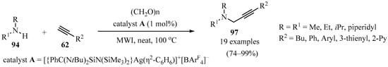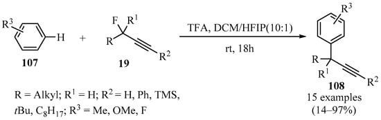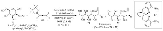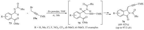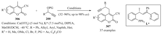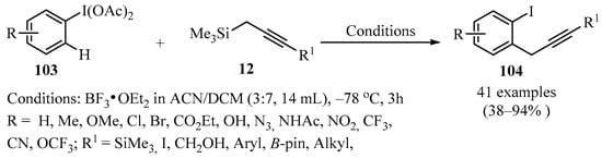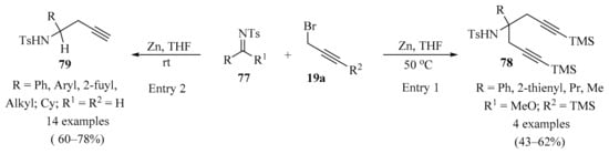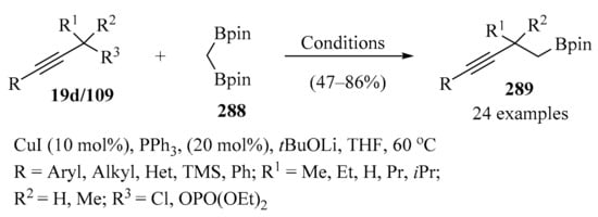 Propargyl–/allenyl–boron-based compounds are a family of propargylation reagents with easy availability and relatively low costs, and for this reason, they are widely used in the propargylation processes of diverse organic substrates, as summarized in Table 2 and Scheme 2, Scheme 3 and Scheme 4.