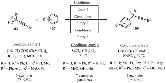 - Peng, S.; Wang, L.; Wang, J. Iron-catalyzed ene-type propargylation of diarylethylenes with propargyl alcohols. Org. Biomol. Chem. 2012, 10, 225–228. [Google Scholar] [CrossRef] [PubMed]