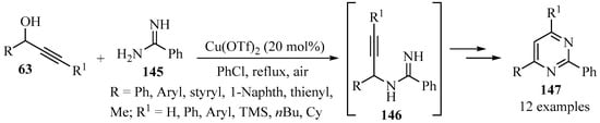 - Lin, M.; Chen, Q.-Z.; Zhu, Y.; Chen, X.-L.; Cai, J.-J.; Pan, Y.-M.; Zhan, Z.-P. Copper(II)-catalyzed synthesis of pyrimidines from propargylic alcohols and amidine: A propargylation–cyclization–oxidation tandem reaction. Synlett 2011, 2011, 1179–1183. [Google Scholar] [CrossRef]