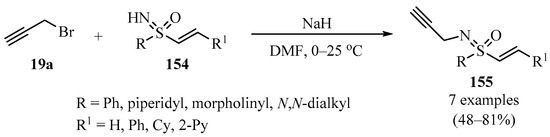 - Craven, G.B.; Briggs, E.L.; Zammit, C.M.; McDermott, A.; Greed, S.; Affron, D.P.; Leinfellner, C.; Cudmore, H.R.; Tweedy, R.R.; Luisi, R.; et al. Synthesis and configurational assignment of vinyl sulfoximines and sulfonimidamides. J. Org. Chem. 2021, 86, 7403–7424. [Google Scholar] [CrossRef]